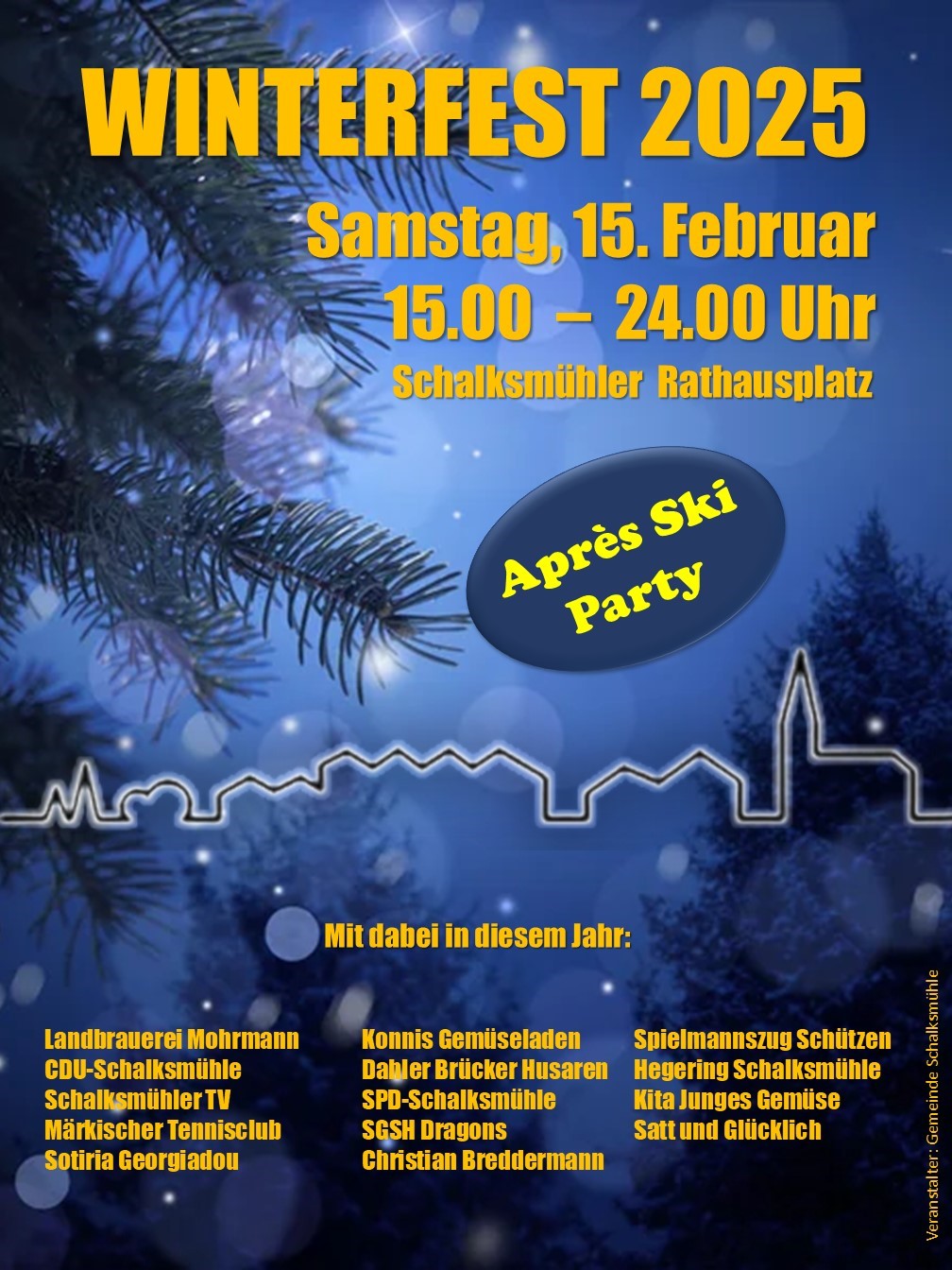 Für die passende Partystimmung wird eine große Tanzfläche mitten auf dem Rathausplatz aufgebaut und DJ Dirk Weiland sorgt mit altbekannten und aktuellen Après-Ski-Partyhits für gute Stimmung. Kommt vorbei und feiert mit! Der Eintritt ist frei